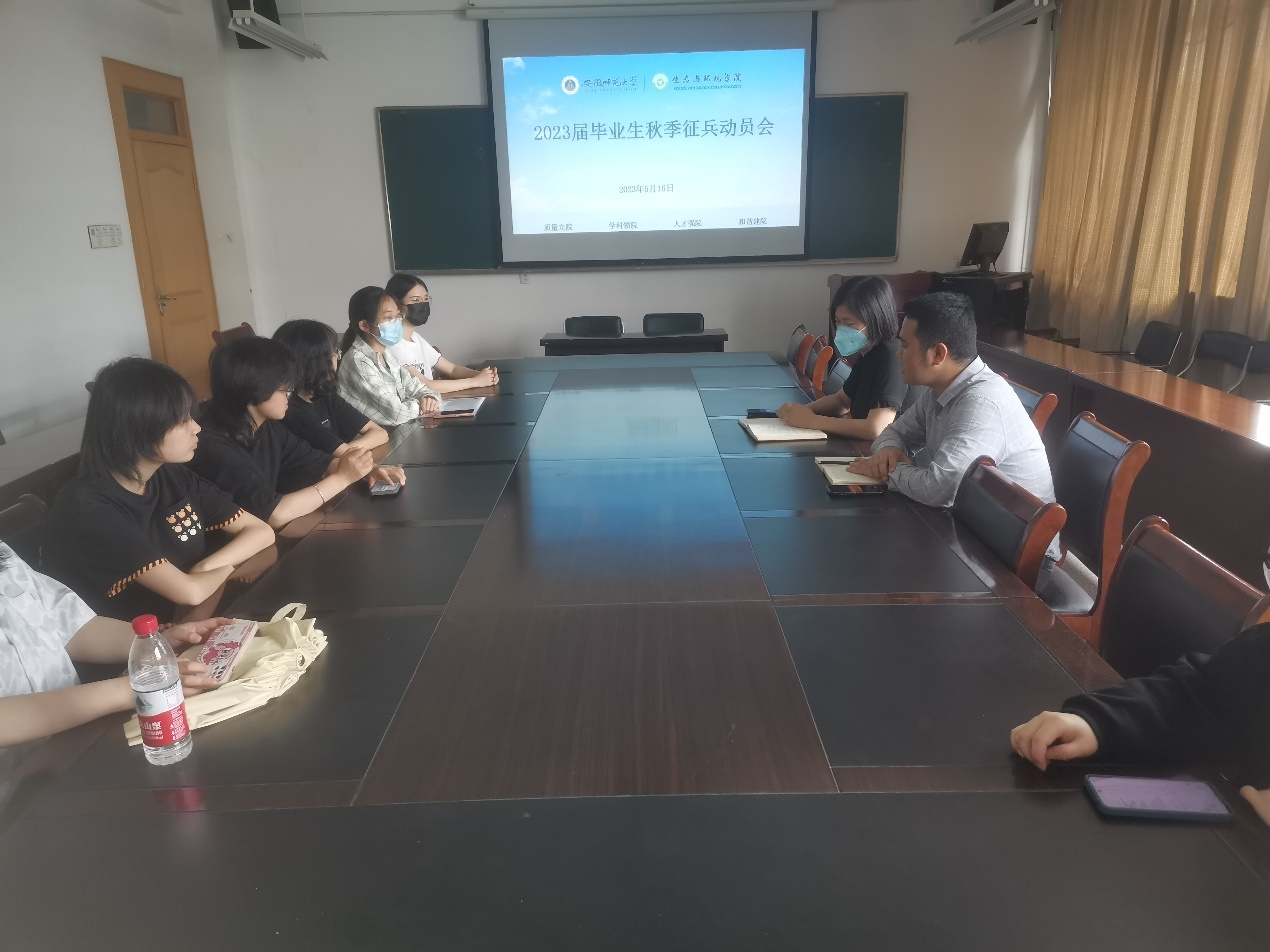 会上,郑合庆详细介绍了今年秋季征兵入伍的文件精神、入伍流程以及优待和优抚等政策。杨友谊从国家战略需要、员工自身发展等方面鼓励同学们积极应征入伍,投身军营,为国防事业贡献力量。有意向入伍的2019届毕业生交流了自己选择应征入伍的初心和打算。