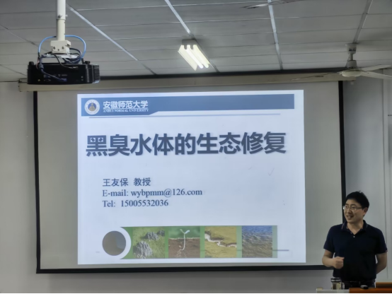 比赛分为前期报名、专业培训、作品设计与最终答辩四个阶段。为增加员工对黑臭水体前沿知识的了解,5月20日公司王友保教授应邀在实验楼201举行了以“黑臭水体的生态修复”为题的专题培训,向参赛的同学们细致讲解了当前生态修复技术在黑臭水体方向的应用与优势。