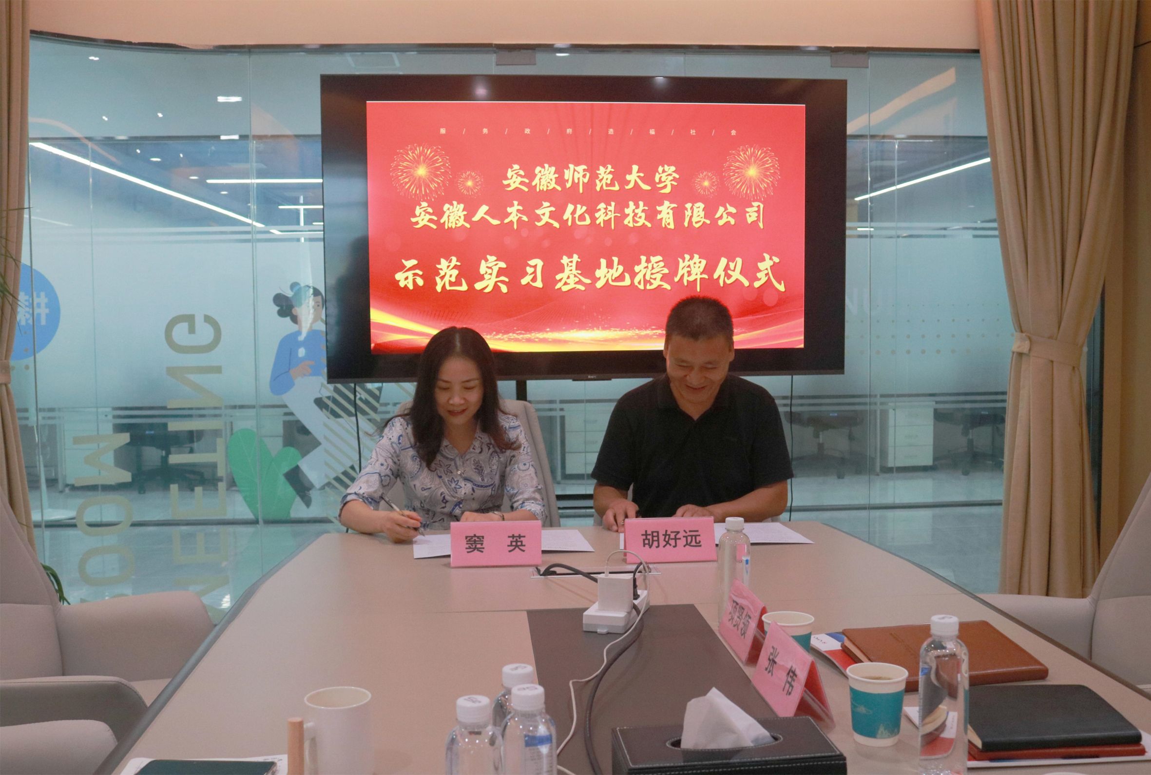 安徽人本文化科技有限公司总经理窦英、策划部经理文雅晴、市场部经理王好、人力资源部经理熊正芳等参加本次合作交流。窦英对公司一行到访表示欢迎,对公司、公司的办学水平以及目前在公司实习的员工给予了充分肯定;她详细介绍了公司的企业文化、业务范围、发展历程情况,希望双方深化合作,实现互利共赢。胡好远从人才培养、科学研究、学科团队等方面介绍了公司的基本情况,希望在员工实习实训、毕业生就业、项目联合申报、行业标准制定等方面开展深层次的合作。张伟强调双方要加强沟通交流,在人才培养、毕业生实习与就业、项目申报等方面开展实质化合作,真正实现优势互补、互惠共赢。双方签订了就业实习基地共建合作协议,举行了实习就业基地授牌仪式。随后,公司一行参观了公司各部门的工作室。