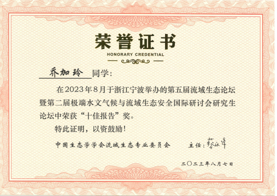 本次会议由中国生态学学会流域生态专业委员会和宁波大学共同主办,由宁波大学土木工程与地理环境公司承办,吸引了来自国内90余所高校和企事业单位,以及美国、德国、英国、丹麦、波兰、南非、马来西亚、斯里兰卡等国家的270余名专家学者参会。会议设立了大会特邀报告、专题报告和研究生论坛等部分,与会人员就“流域生态学助力区域绿色协同发展“等多方面研究内容进行了研讨和交流。公司温新利、张晨和葛奕豪老师受邀分别做了题为《模拟太阳光下纳米二氧化钛对萼花臂尾轮虫的毒性及机制》、《种间作用在溪流鱼类群落构建中的重要性》和《扩散性状调节河网中水生昆虫距离衰减关系—以堵河流域为例》的专题报告;博士生乔加玲同学参加研究生论坛并做了专题报告《The human-modified landscapes decrease the ecological uniqueness of subtropical stream fish communities》,经评审获得本次会议研究生学术报告十佳奖。