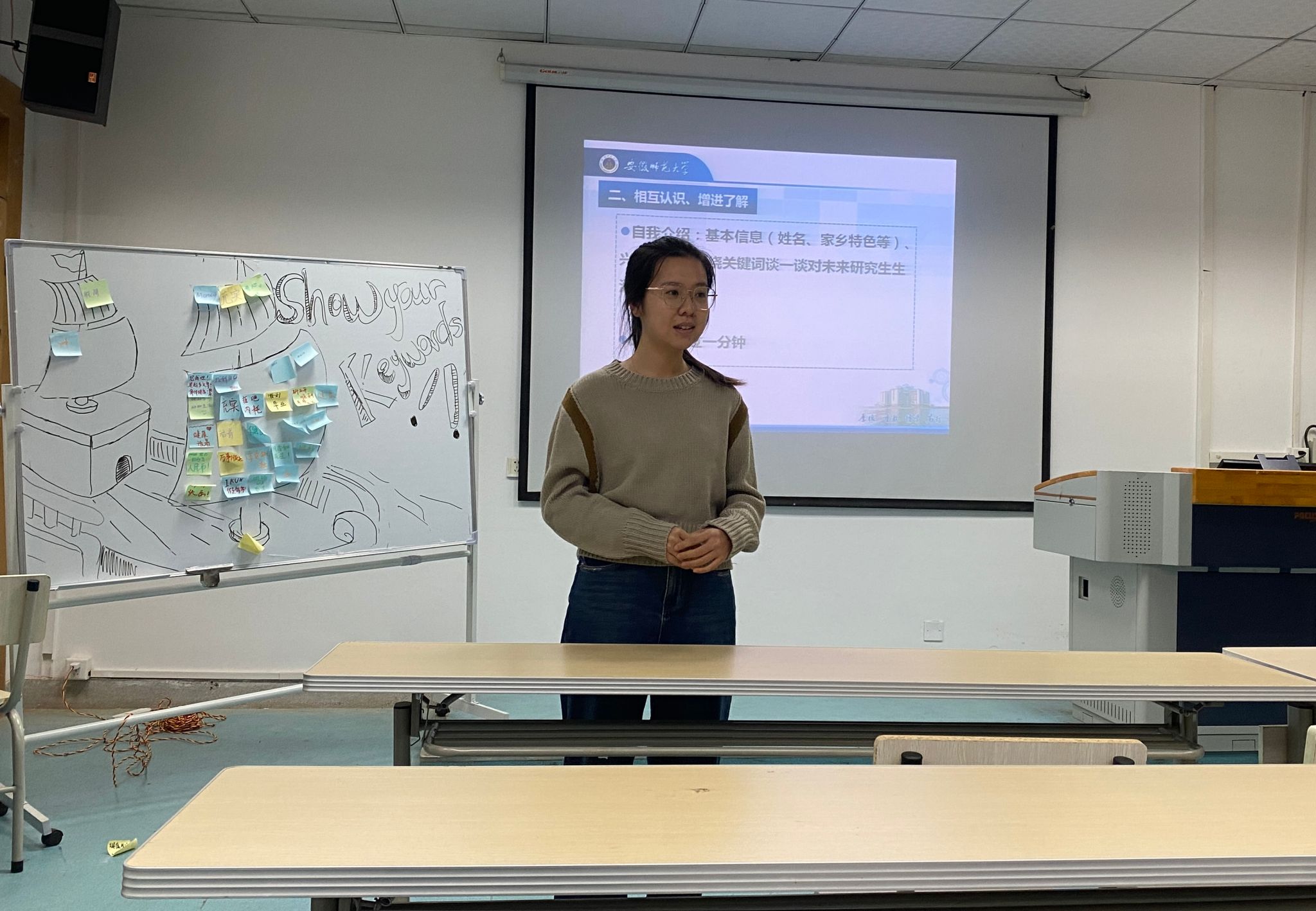 为促进新生之间相互认识和了解,全体博士及硕士新生轮流上台进行了自我介绍。来自五湖四海的同学们从家乡特色、兴趣爱好谈到自己未来研究生生活的关键词,现场氛围热烈愉快,大家在活动中增进了彼此感情,提高了新集体的凝聚力。2023级硕博连读研究生史宝春与师弟师妹们分享了在师大学习的感受以及硕士期间宝贵的学习经验和方法,帮助硕士新生尽快适应新环境、新生活。
