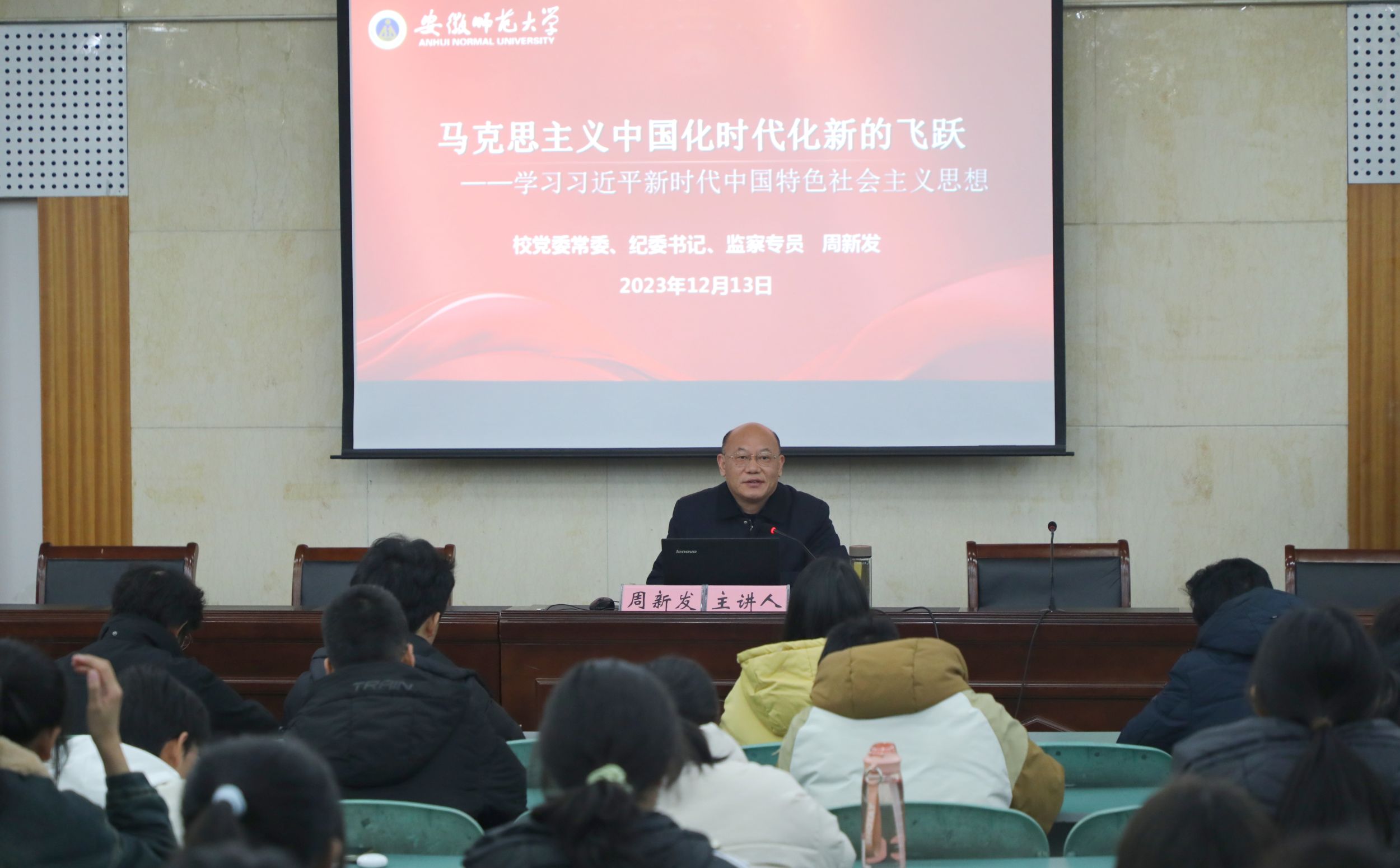 12月13日下午,公司党委常委、纪委书记、监察专员周新发以《马克思主义中国化时代化新的飞跃——学习习近平新时代中国特色社会主义思想》为题,为公司2023级本科生讲授“形势与政策”课暨思政理论课。公司党委书记张伟、党委副书记杨友谊、副经理昝逢宇、严云志、2023级环境工程专业本科生参加报告会。报告会由张伟主持。