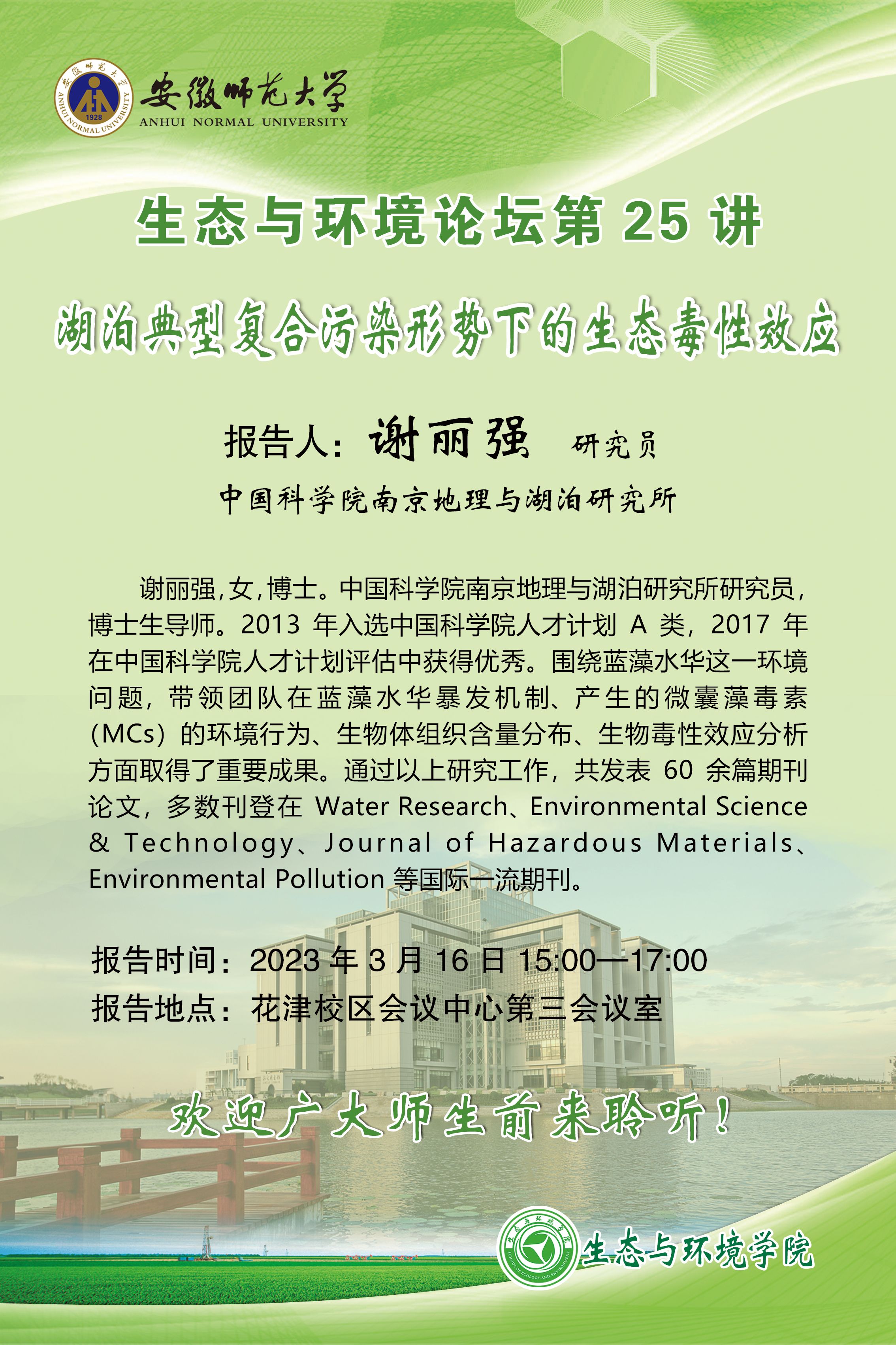 【学术预告】生态与环境论坛第25讲:湖泊典型复合污染形势下的生态毒性效应