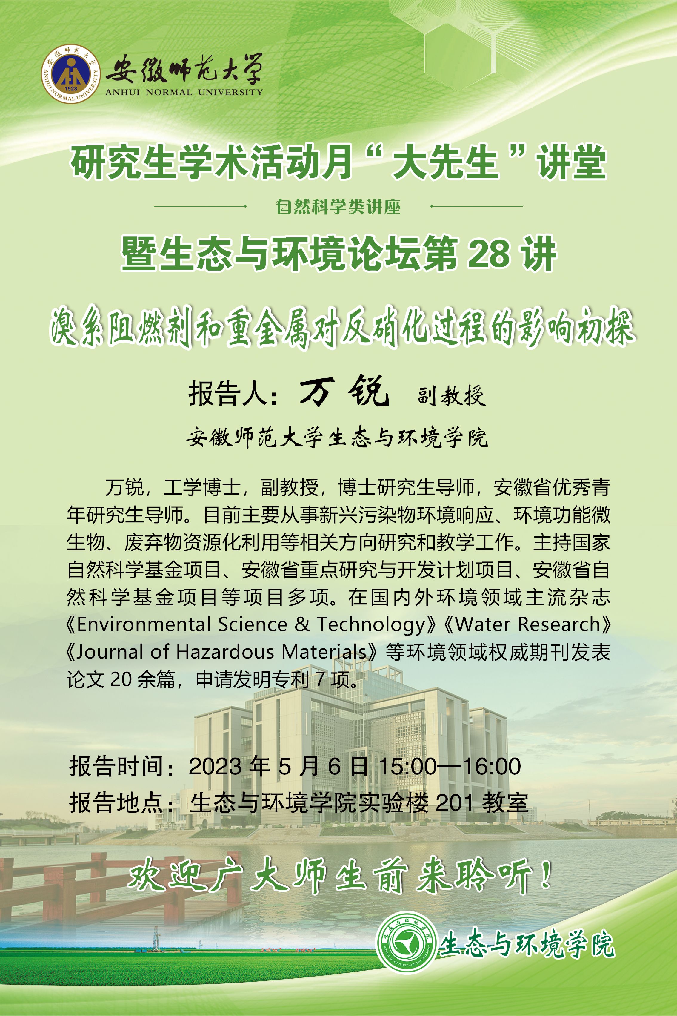 【学术预告】研究生学术活动月“大先生”讲堂暨生态与环境论坛第28讲:溴系阻燃剂和重金属对反硝化过程的影响初探