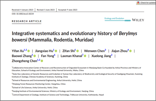 相比于去实验室“捣鼓”,徐一凡觉得更为棘手的是论文的撰写,一篇全英文科研论文的发表不仅考验作者的研究成果,更是需要极高的专业英文表达水平和文献储备知识量,对于本科生来说几乎是寸步难行,在文章撰写期间,阅读了上千份文献,批注汇总近二百篇。功夫不负有心人,4年来,他熟练掌握了小型兽类分类及分子实验相关知识,提升了文献查阅及关键知识抓取能力,以第一作者在杂志《Ecology and Evolution》(中科院二区)发表“Integrative systematics and evolutionary history of Berylmys bowersi (Mammalia, Rodentia, Muridae)”,以第二作者在杂志《Zookeys》(中科院二区)发表“A new species of shrew moles, genus Uropsilus Milne-Edwards, 1871 (Mammalia, Eulipotyphla, Talpidae), from the Wuyi Mountains, Jiangxi Province, eastern China”,以第二作者在杂志《兽类学报》参与发表“江西省两种兽类新纪录——东阳江麝鼩和安徽麝鼩”。