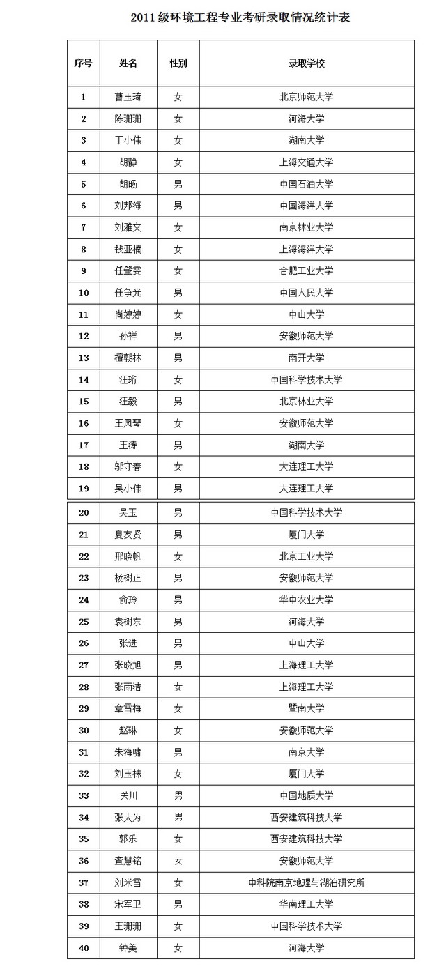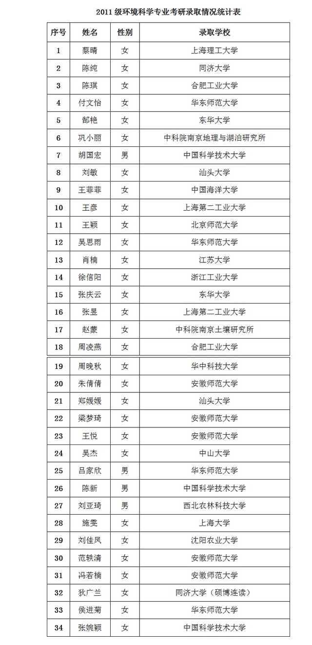2011环境科学、环境工程两个专业共有毕业生166名,80名同学考研初试成绩达到国家线(包括保研),占员工总数的48.19%,其中环境科学专业达线率为47.37%,环境工程专业达线率为48.89%。最后共有74名同学被录取,6名同学放弃调剂。考研最终录取率为 44.58%,其中环境科学专业最终录取率为44.74%,环境工程专业最终录取率为44.44%。