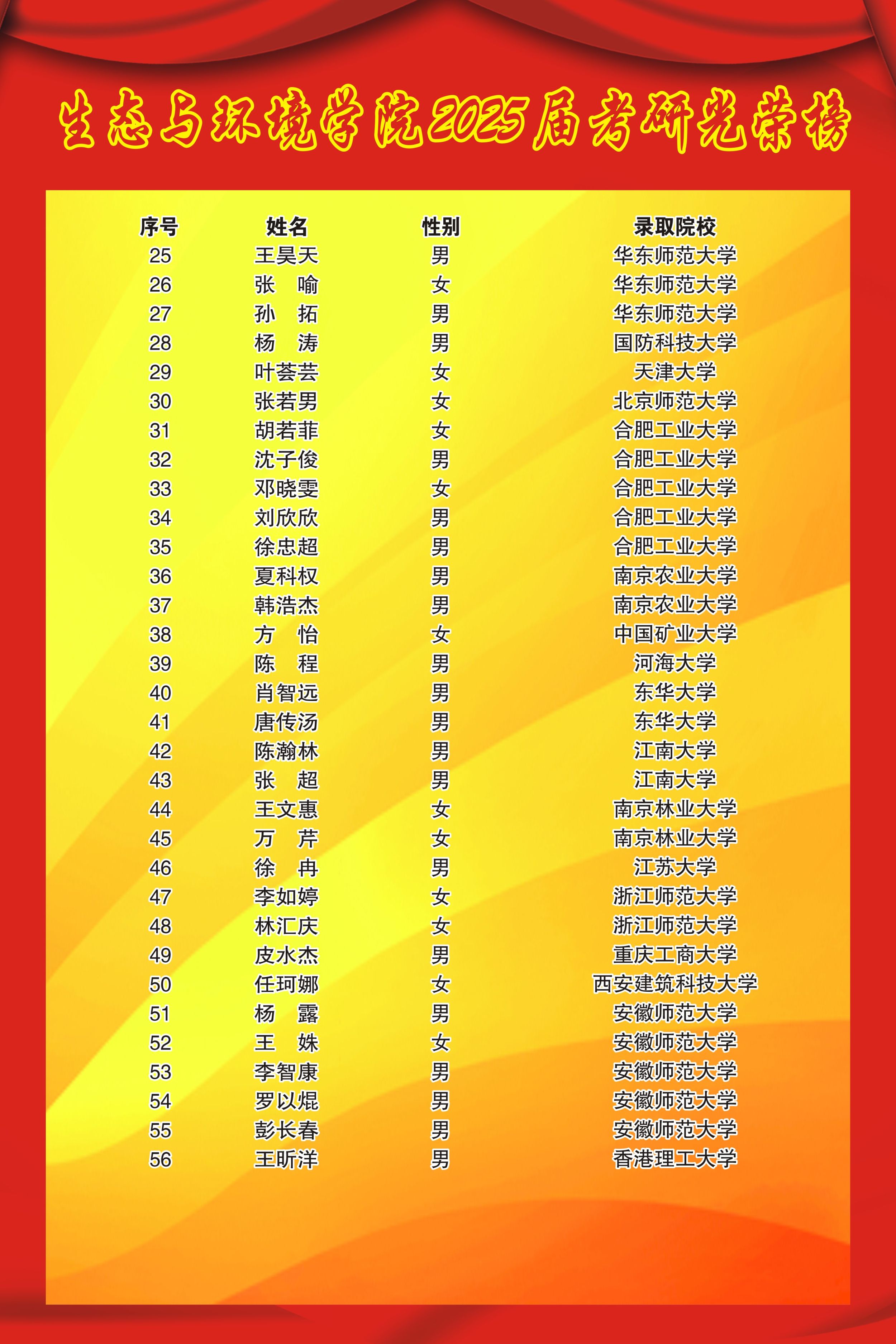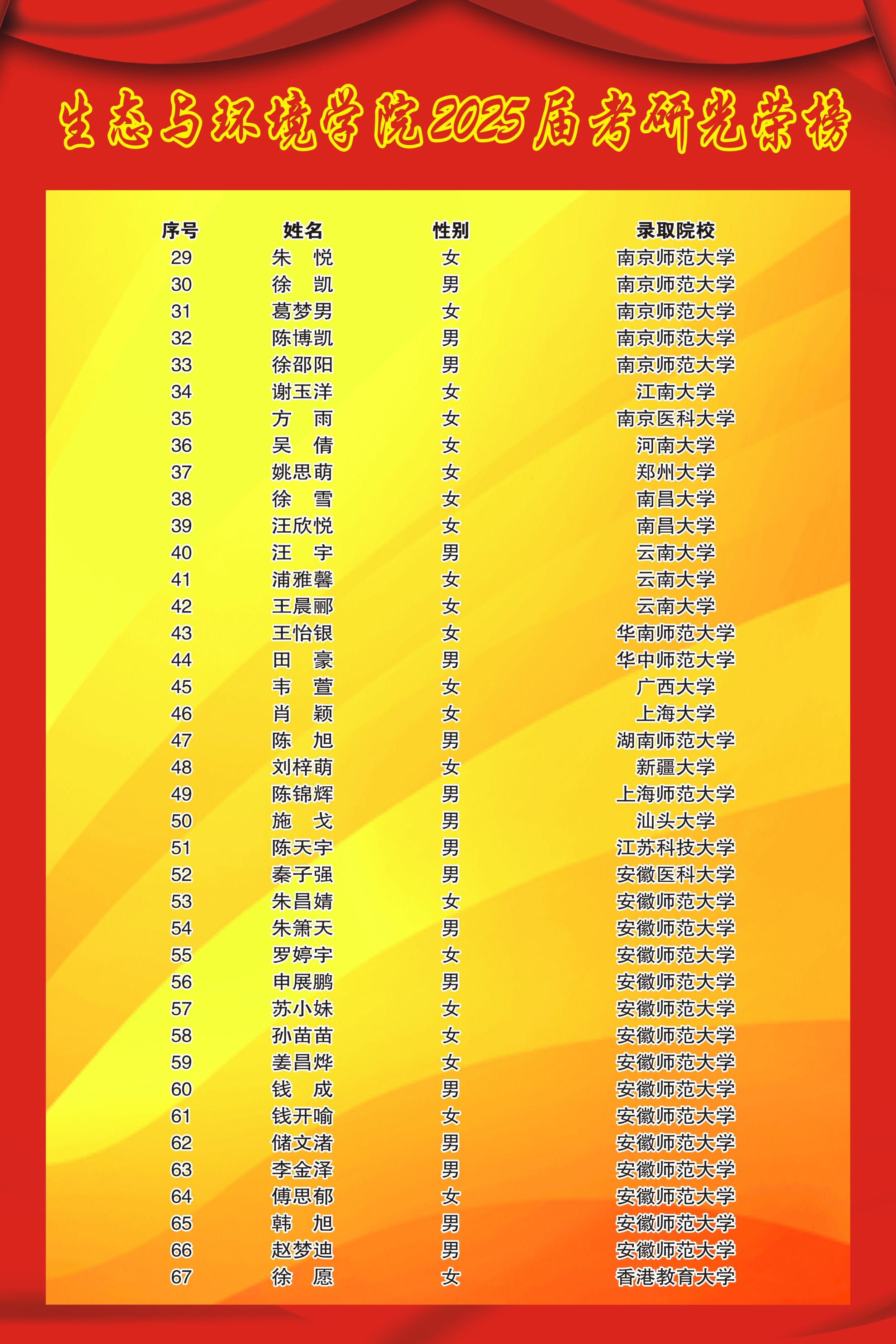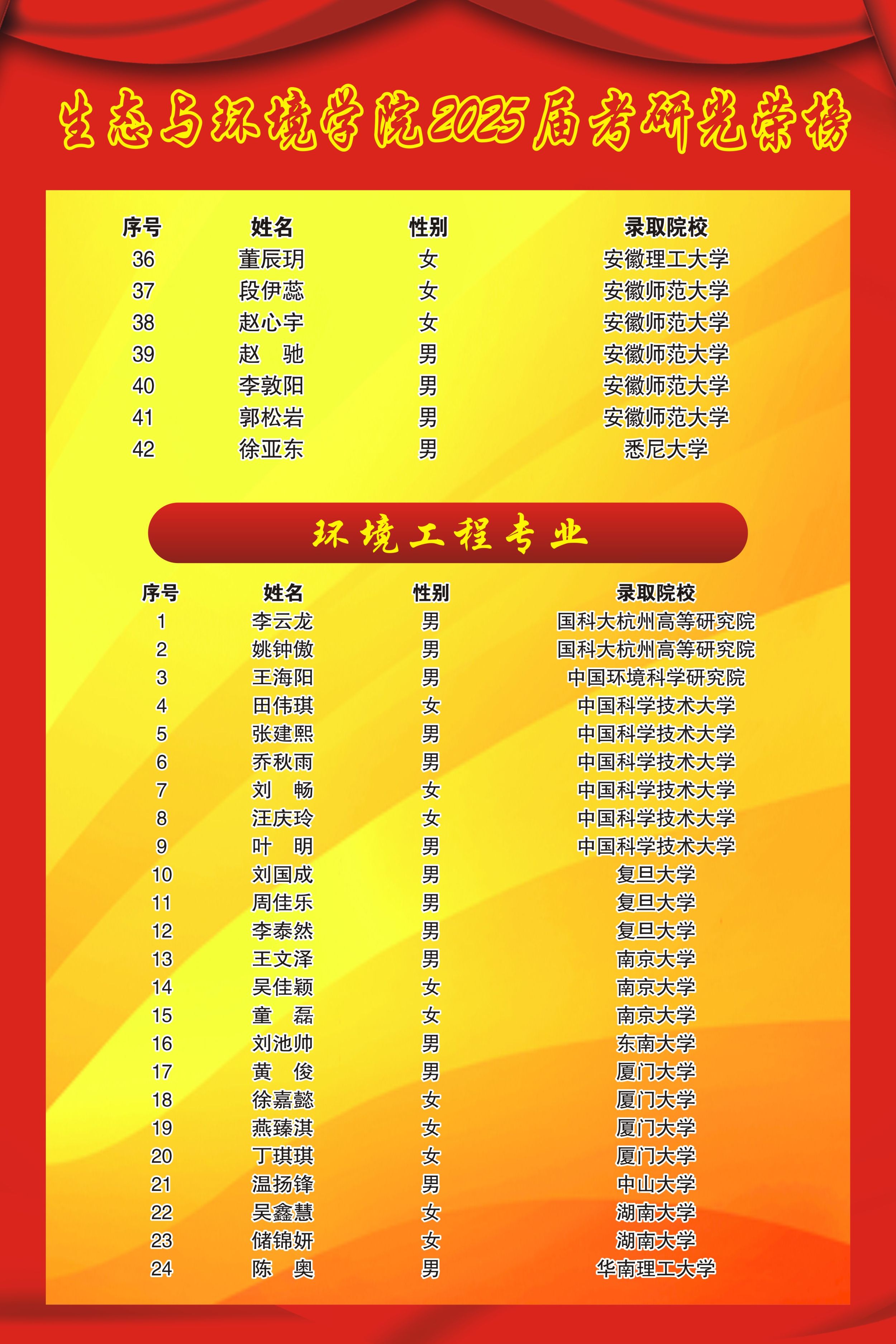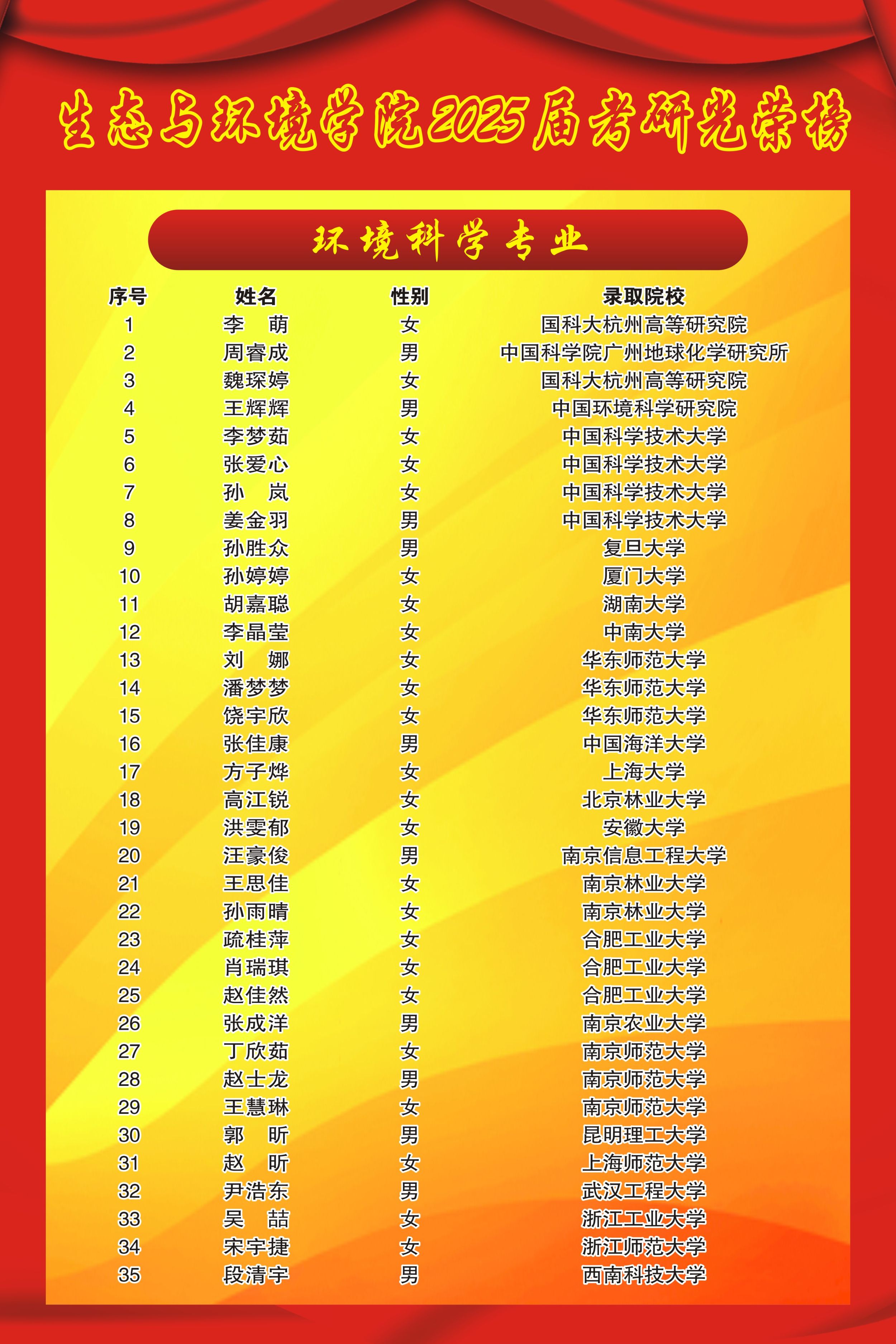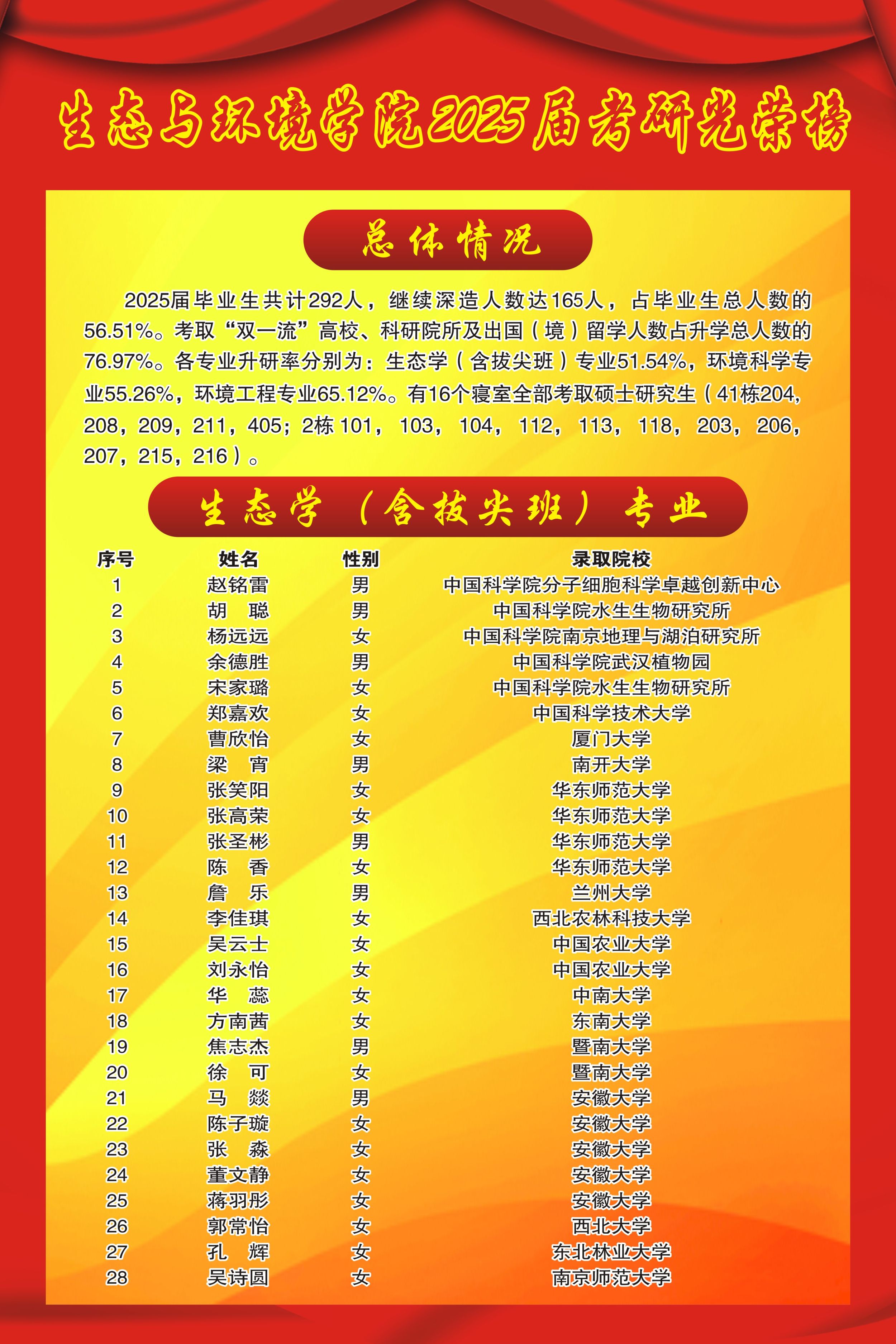 2025年全国研究生招生录取工作已经结束,公司2025届本科毕业生共计292人,继续深造人数达165人,占毕业生总数的56.51%,升研率再创佳绩。其中162人被国内高校录取,3人被国(境)外知名公司录取。考取“双一流”高校、科研院所和出国(境)人数占升学总人数的76.97%,包括中国科学技术大学、复旦大学、国防科技大学、南京大学、南开大学、厦门大学等。各专业升研率分别为:生态学(含拔尖班)专业51.54%,环境科学专业55.26%,环境工程专业65.12%。有16个寝室员工全部考取硕士研究生,成为“学霸寝室”。
