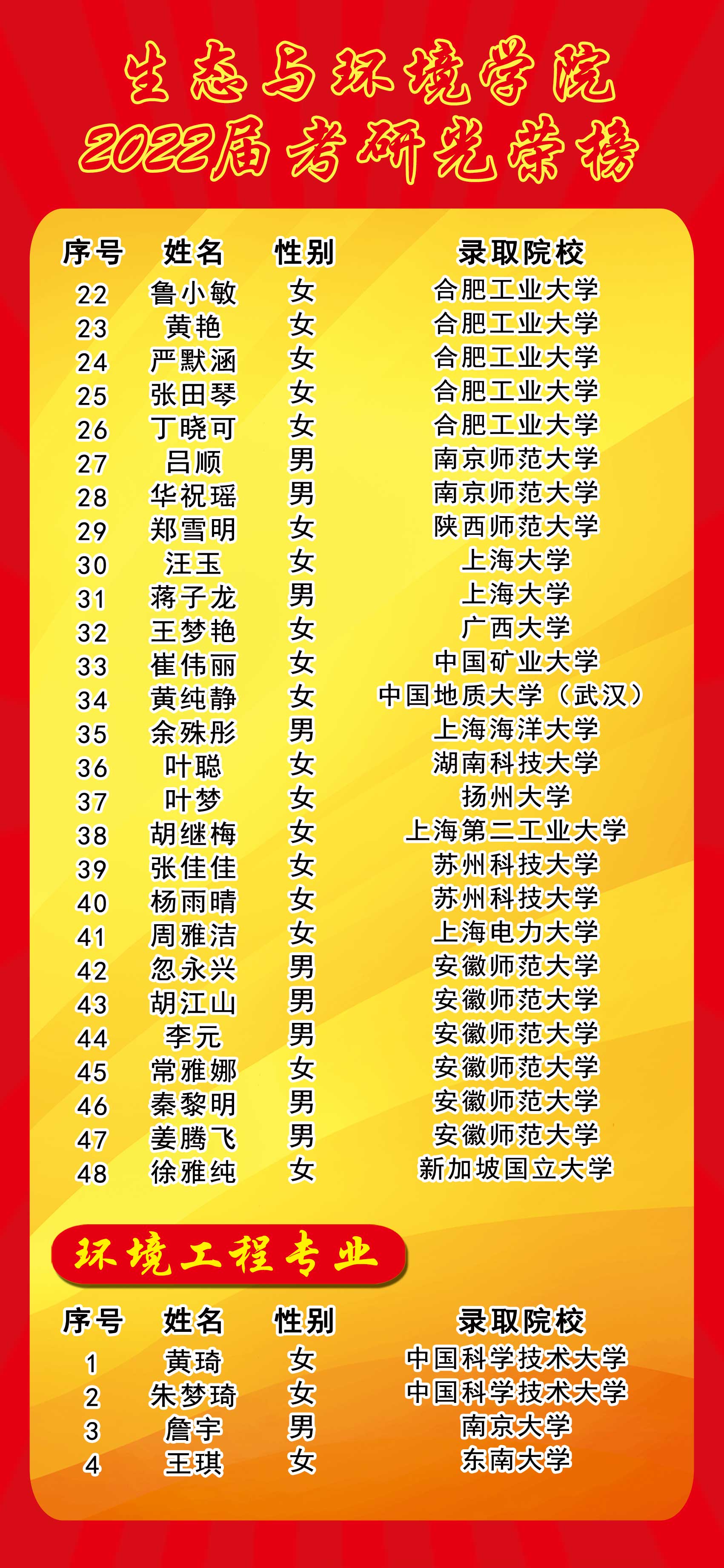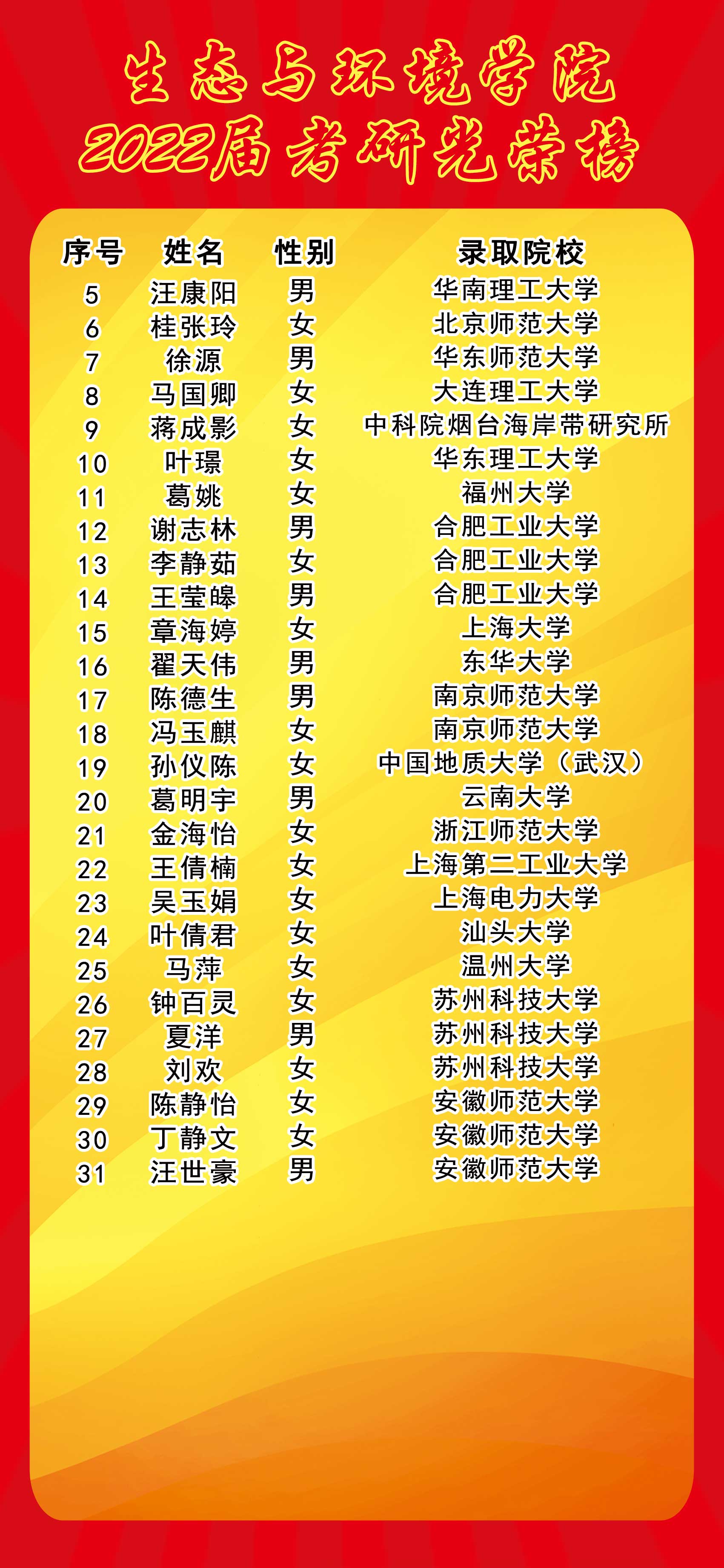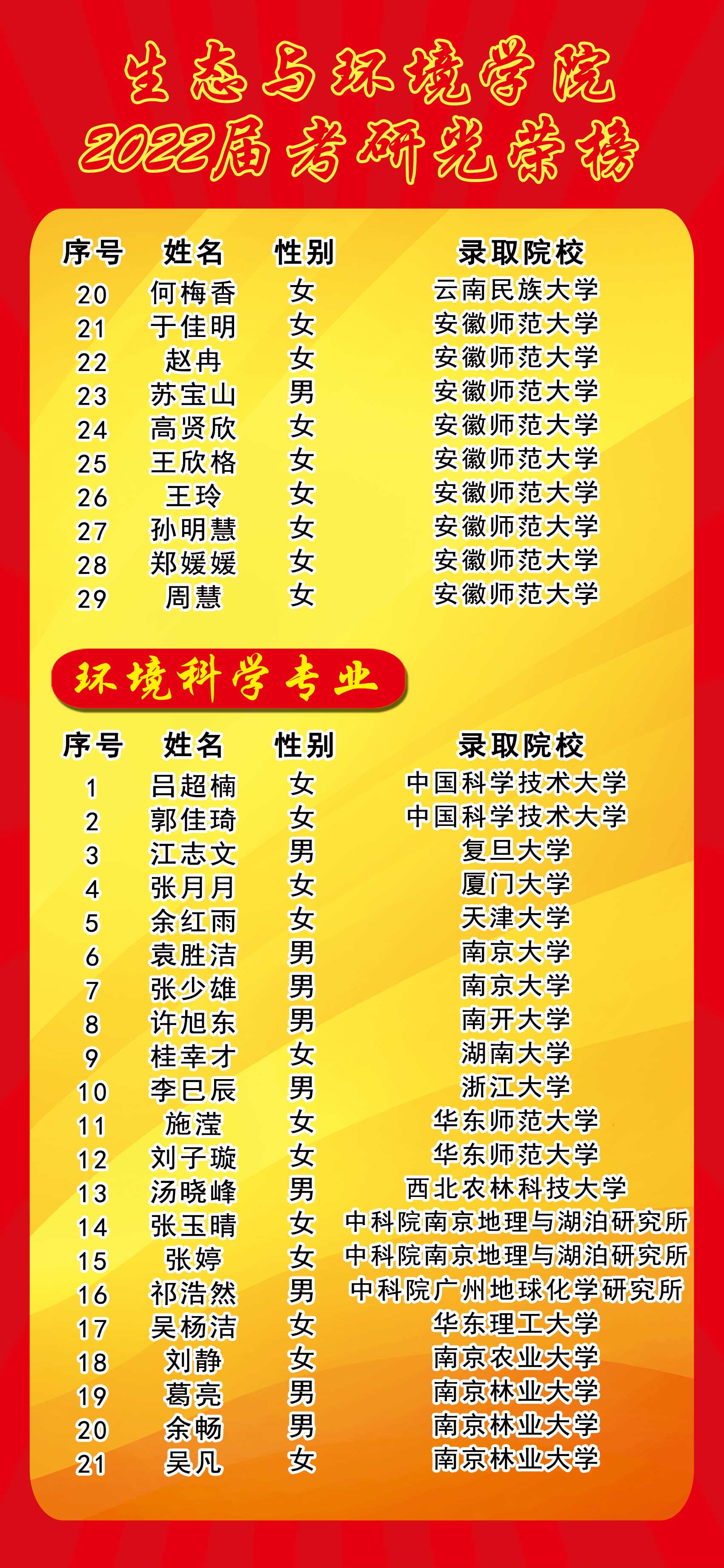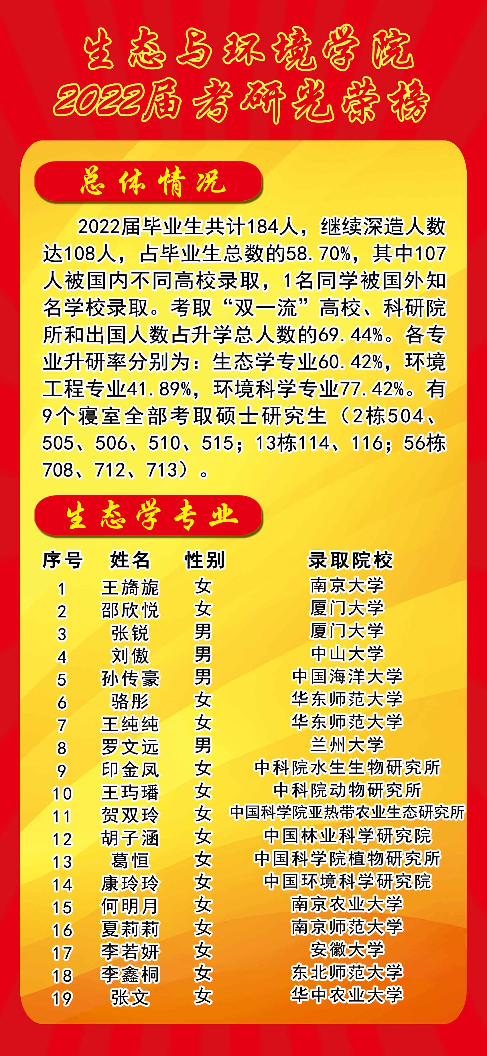 2022年全国研究生招生录取工作落下帷幕,公司2022届毕业生共计184人,继续深造人数达108人,占毕业生总数的58.70%,再创公司升研率新高,位居全校第一。其1中07人被国内高校录取,1人被国外知名公司录取。考取“双一流”高校、科研院所和出国人数占升学总人数的69.44%,包括中国科学技术大学、复旦大学、大连理工大学、南京大学、天津大学、厦门大学等。各专业升研率分别为:生态学专业60.42%,环境工程专业41.89%,环境科学专业77.42%。有9个寝室员工全部考取硕士研究生,成为“学霸寝室”。