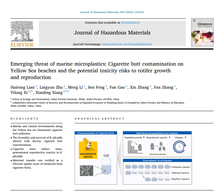 近日,公司水生态环境团队项贤领教授课题组在微塑料生态毒理评估研究中取得了新进展,相关研究成果以题为“Emerging threat of marine microplastics: Cigarette butt contamination on Yellow Sea beaches and the potential toxicity risks to rotifer growth and reproduction”的论文发表于国际学术期刊《Journal of Hazardous Materials》(英国365集团官网1区Top,IF = 12.2)。论文第一作者为生态学博士研究生廉海荣,通讯作者为项贤领。