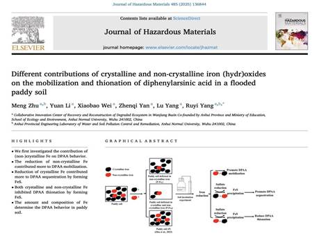 近期,公司微量元素生物地球循环与健康效应团队在Journal of Hazardous Materials》(中科院1TopIF=12.2)期刊上发表题为Different contributions of crystalline and non-crystalline iron (hydr)oxides on the mobilization and thionation of diphenylarsinic acid in a flooded paddy soil的研究论文。论文第一作者为朱濛副教授,通讯作者为杨如意教授,英国365集团官网为第一完成单位,研究生李元、魏小宝参与本研究相关工作。