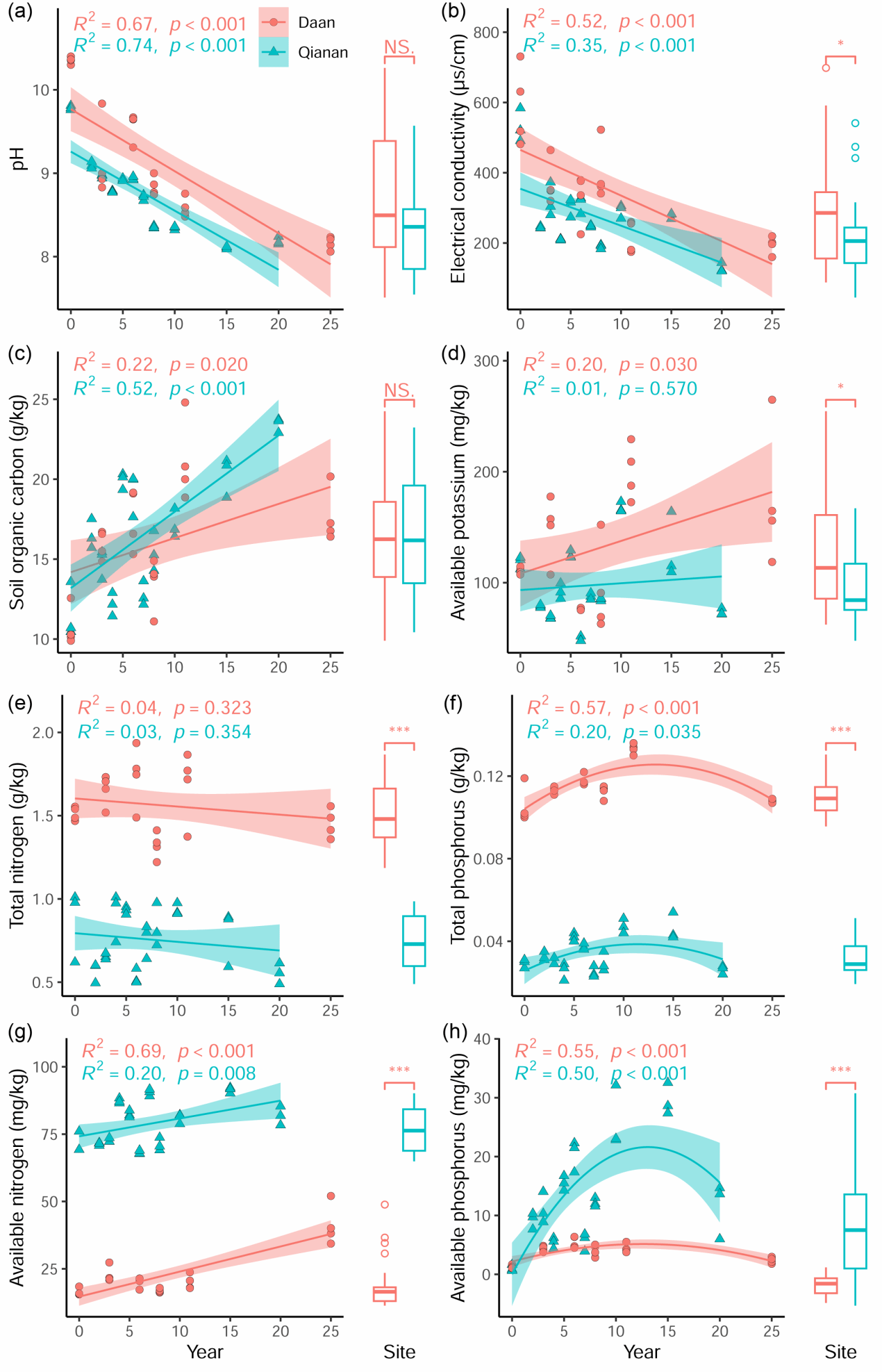 研究团队假设:若土壤改良(如pH降低和SOC增加)是影响微生物碳循环功能的主导因素,则碳循环基因的多样性和丰度将随水稻种植年限增加而提升,此时SOC积累主要受外源有机物增加的驱动;反之,若稻田淹水环境的影响更为显著,则可能抑制微生物碳循环基因,使有机物分解速度变减缓成为SOC积累的主要驱动力。为验证这一假设,研究团队在大安和乾安两地采集了不同种稻年限的土壤样品,采用宏基因组测序分析了土壤微生物群落结构及其功能特征。研究发现水稻种植显著提高了SOC含量、降低了土壤pH,有效改善了土壤健康状况。尽管两地土壤初始养分含量存在显著差异,但其随种稻年限的变化趋势一致,如速效氮均持续升高,速效磷呈现先升后降的趋势。碳循环基因的多样性随水稻种植年限延长而增加,但碳分解相关基因的相对丰度呈下降趋势。碳循环基因主要受土壤pH调控,其次受养分有效性影响,且这种影响具有区域特异性:在速效磷和速效氮含量较低的大安地区,养分对碳循环基因影响显著而SOC影响较弱;在这些养分含量较高的乾安地区,SOC的影响则更为突出。这说明了养分化学计量特征对碳循环基因的重要调节作用。研究进一步发现,种稻后的土壤演替过程可以15年为界分为两个阶段,其中氮和磷的有效性可能是不同阶段限制微生物碳循环功能的关键因素。研究表明,土壤养分有效性、pH以及稻田淹水条件共同作用,通过限制微生物碳分解相关基因的表达,从而促进了盐渍土中SOC的积累。