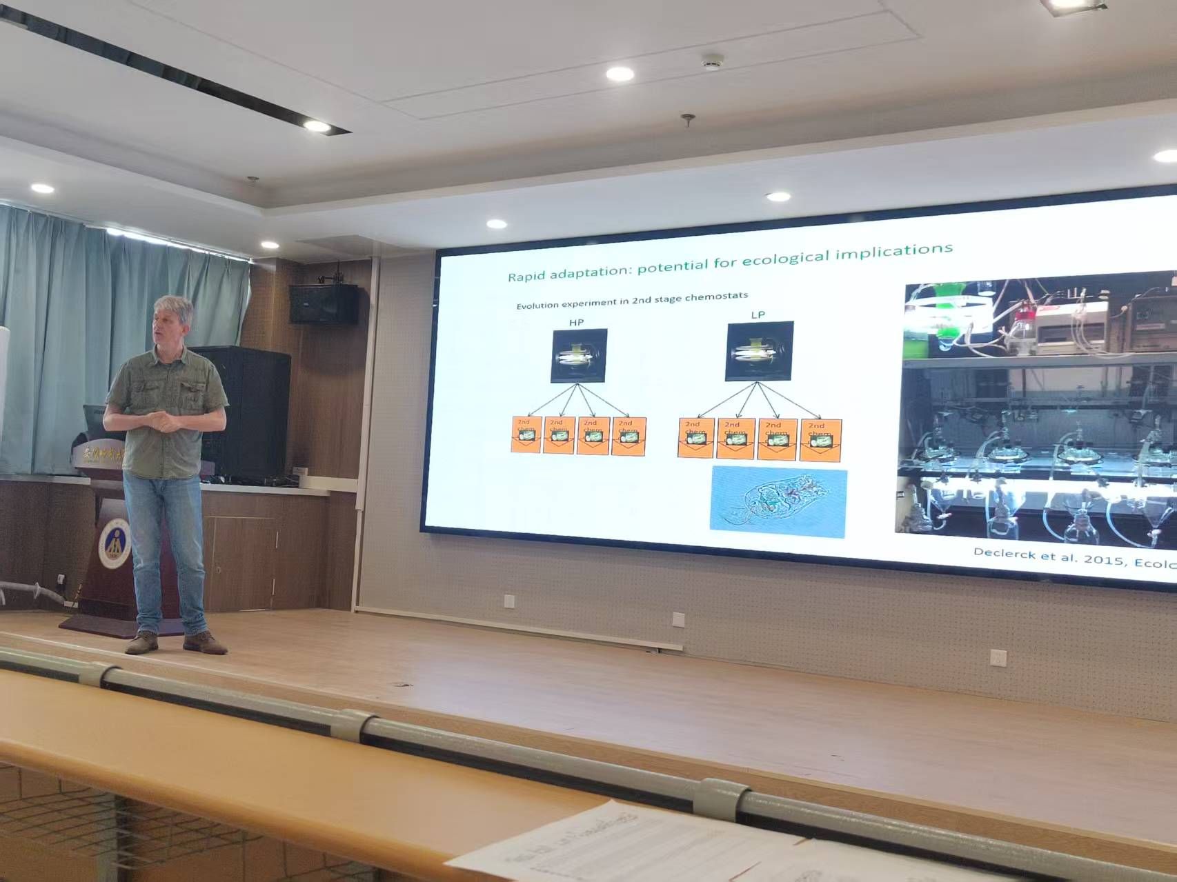 Declerck教授在报告中首先历数了由于人类活动导致的环境变化对众多生物构成的严峻挑战,尤其针对位于食物链底端的淡水浮游生物;然后,Declerck教授聚焦于这一关键生态问题,介绍了他是如何通过设计一系列进化实验,观察轮虫种群在多重环境压力下(如营养元素比例失衡、盐度变化、重金属污染和全球变暖)的适应过程。这些实验结果不仅揭示了微型生物快速适应的分子机制,还为我们理解生态系统韧性和预测未来环境变化下的生物多样性动态提供了重要依据。通过分析这些实验数据,Declerck教授深入探讨环境压力如何重塑生物的生理调节和基因表达模式,以及这些变化对种群长期生存能力的潜在影响。