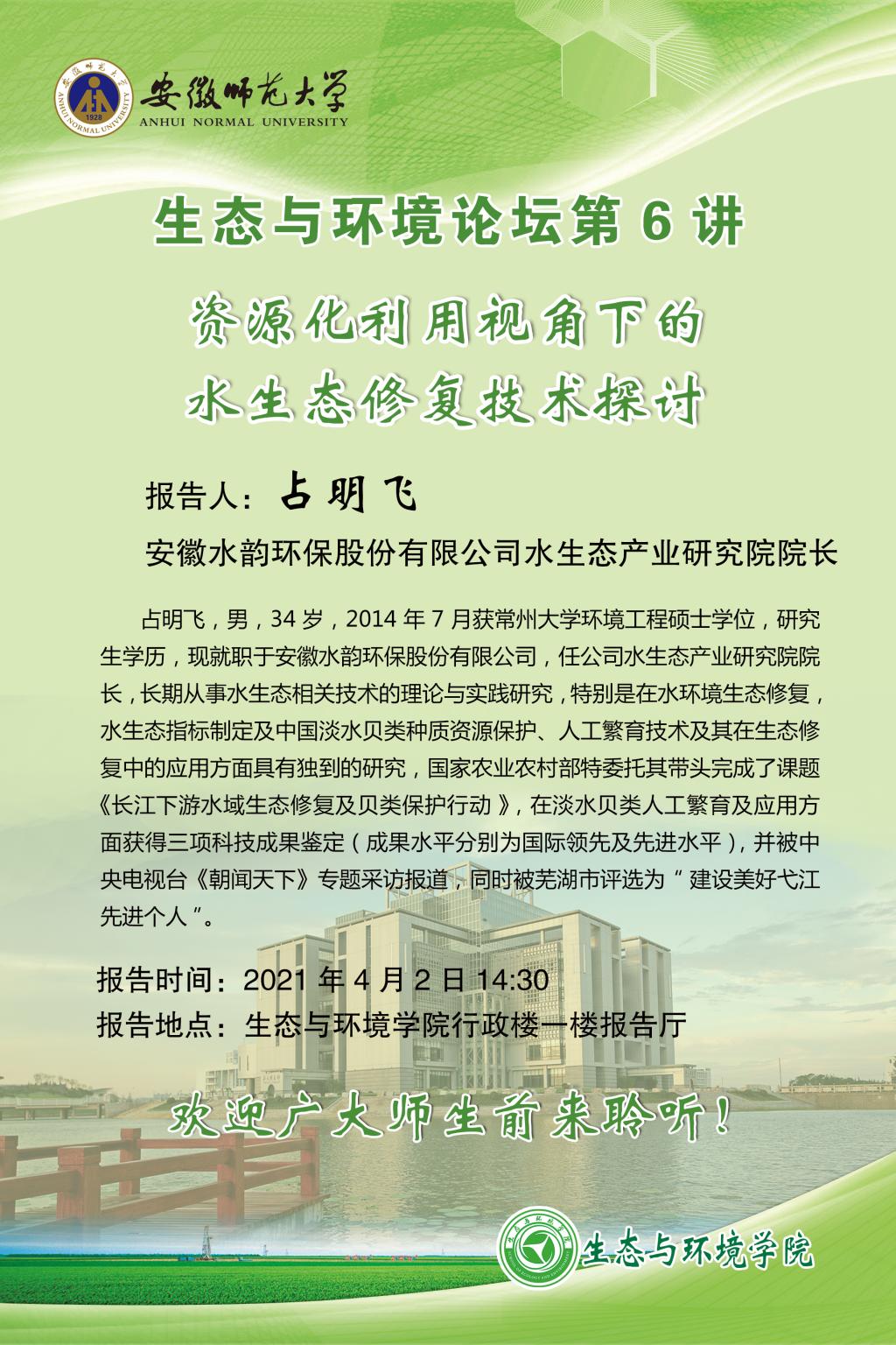 【学术预告】生态与环境论坛第6讲:资源化利用视角下的水生态修复技术探讨