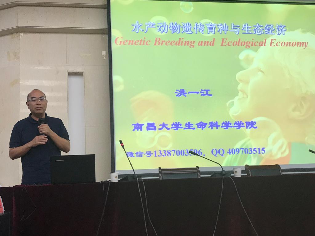 洪一江教授报告中首先对育种学的内容、遗传育种的定义和根本任务进行了简要介绍。通过生态学三定律,提出要建立“社会经济自然”良性循环复合生态系统。其次介绍了我国水产生物遗传育种的特征,水产动物种质资源的特殊性,建立种质资源的重要性以及种质资源研究的主要方向。最后介绍了其课题组在1997年至2020年选育的珠蚌品种——池蝶蚌“鄱珠1号“和团队创造的“八字经”种养法,在稻渔共作模式上的应用。汇报结束后,引起了同学们的思考与讨论,并向与会师生就“如何改善保护区盲目建设现状?”和”新品种如何推广?“问题进行了讨论。