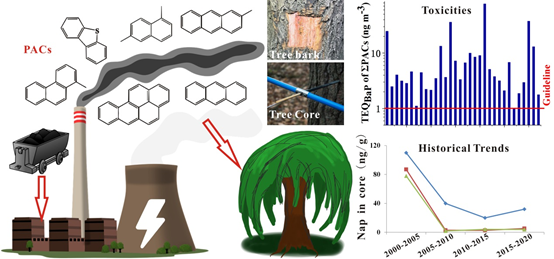 多环芳香类化合物(PACs)具有环境持久性和“三致”效应,是一类重要的大气有毒污染物,并且和化石燃料的使用密切相关。此项研究以树皮为大气被动采样介质,以树芯为历史记录介质,探讨了淮河中游大气中PACs的污染特征、来源和污染历史。结果表明煤炭开采区大气中PACs显著高于其他地区。这一区域大气中PACs主要来自煤炭等化石燃料使用排放(43%)。此外,生物质燃烧(30%)和非燃烧源(27%)也有重要影响。2000年以来,随着大气污染管控力度加强,典型煤炭污染区大气中主要PACs呈现逐年降低趋势,但是大气中PACs的BaP毒性当量浓度显著高于国家标准,值得警惕。