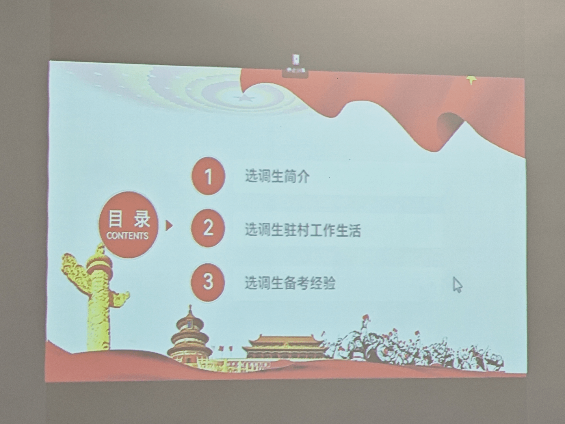 2023届优秀员工丁茂围绕选调生备考主题,简要介绍了选调生选拔的意义、要求,并结合自身工作实际,详细介绍了选调生驻村工作生活的工作要求。丁茂与现场的同学重点分享了选调生备考经验,详细讲解了四套选调生备考笔试题型以及备考策略,并建议同学们奋进正当时,做新时代为国为民的新青年。